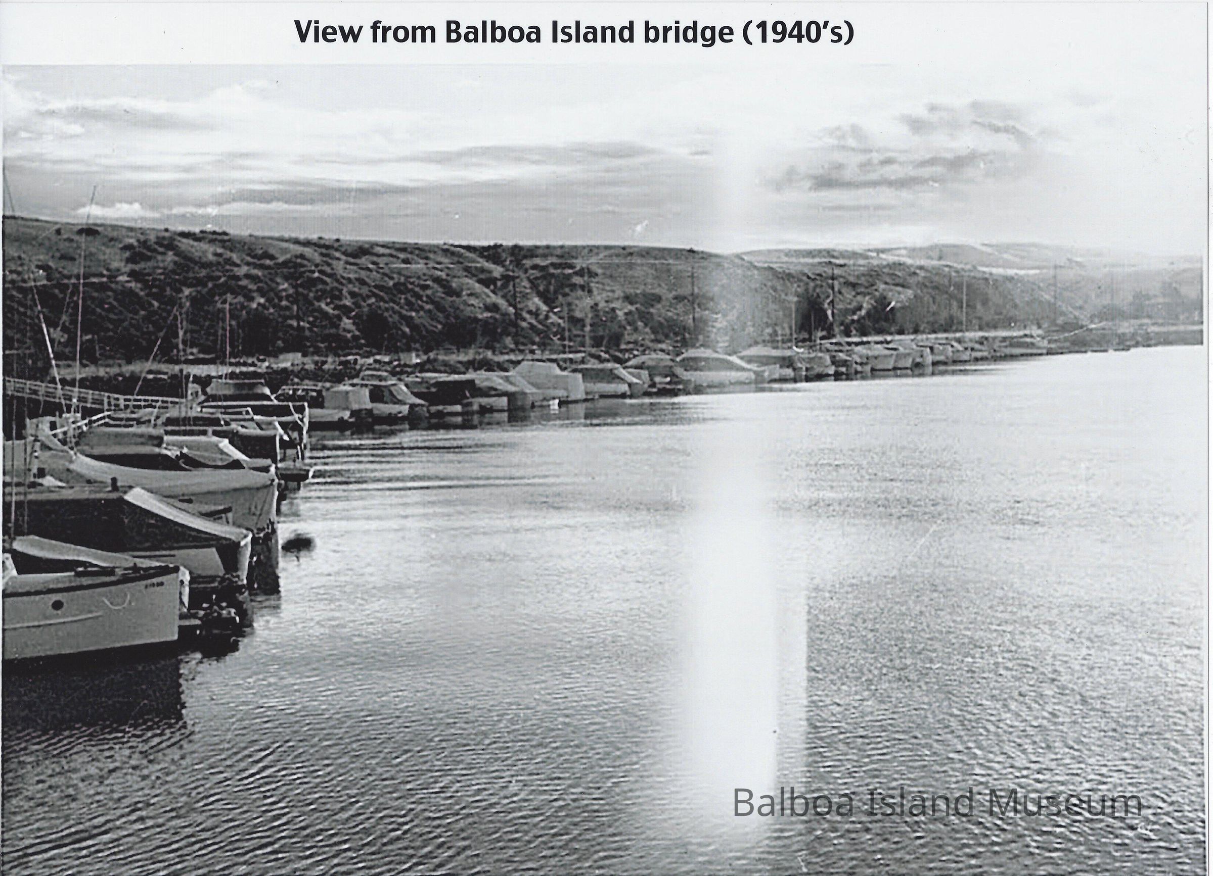 B&W photo of harbor taken from Balboa Island Bridge looking toward Corona del Mar.Lexicon
