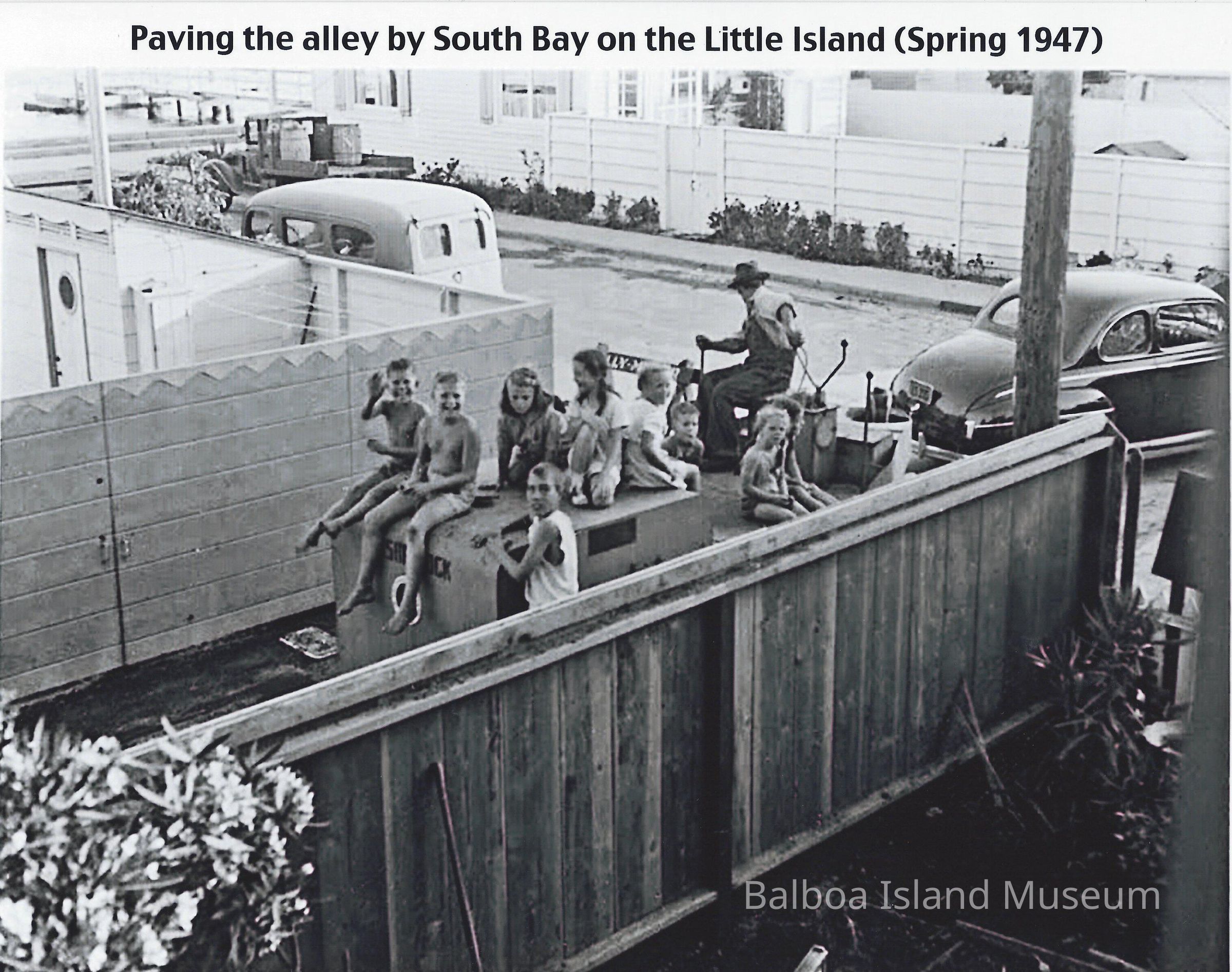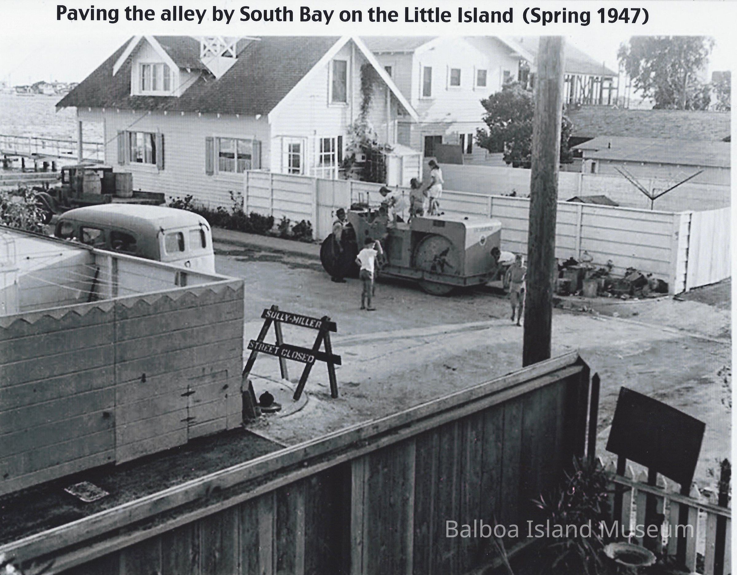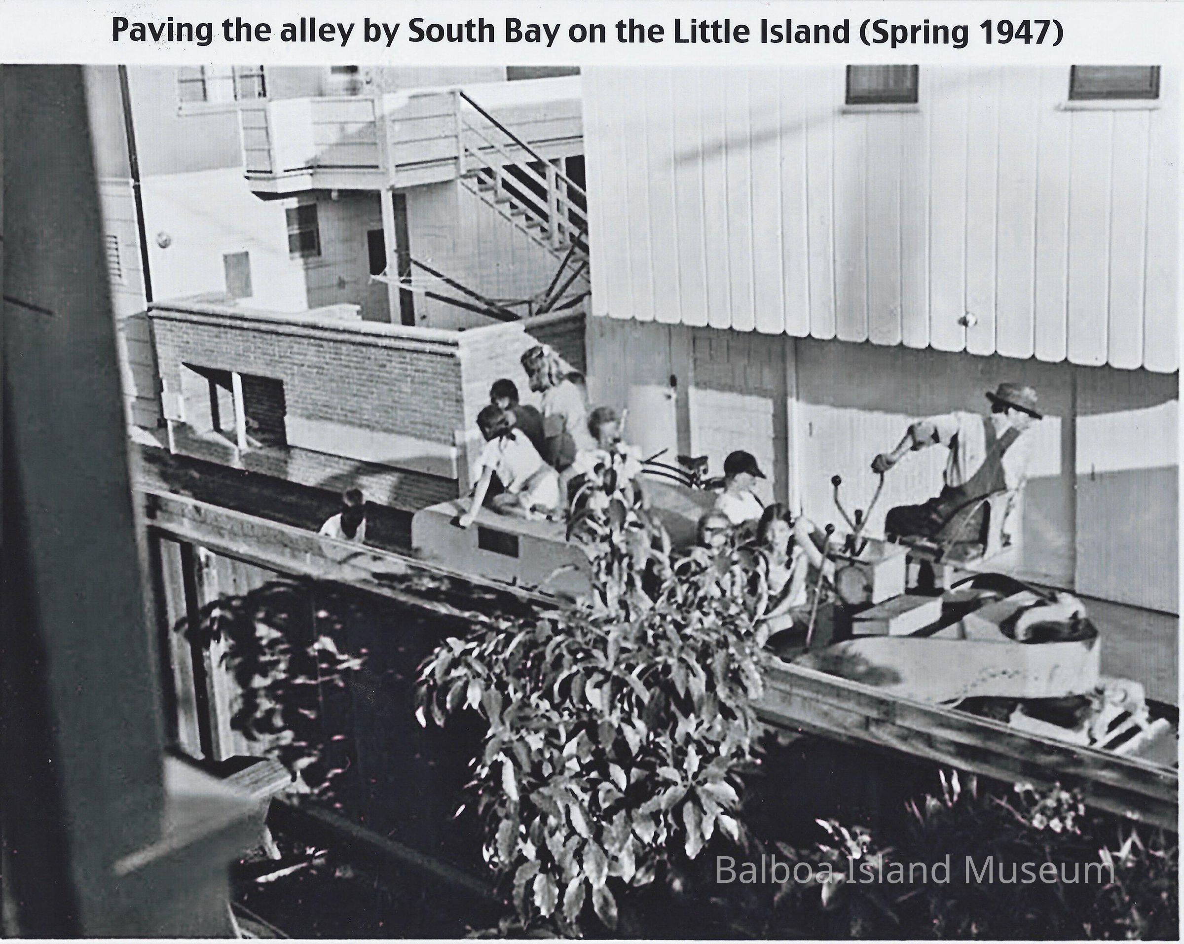 B&W photos of workers paving alley on South Bay Front on Little Island and kids riding on the paver.Collection