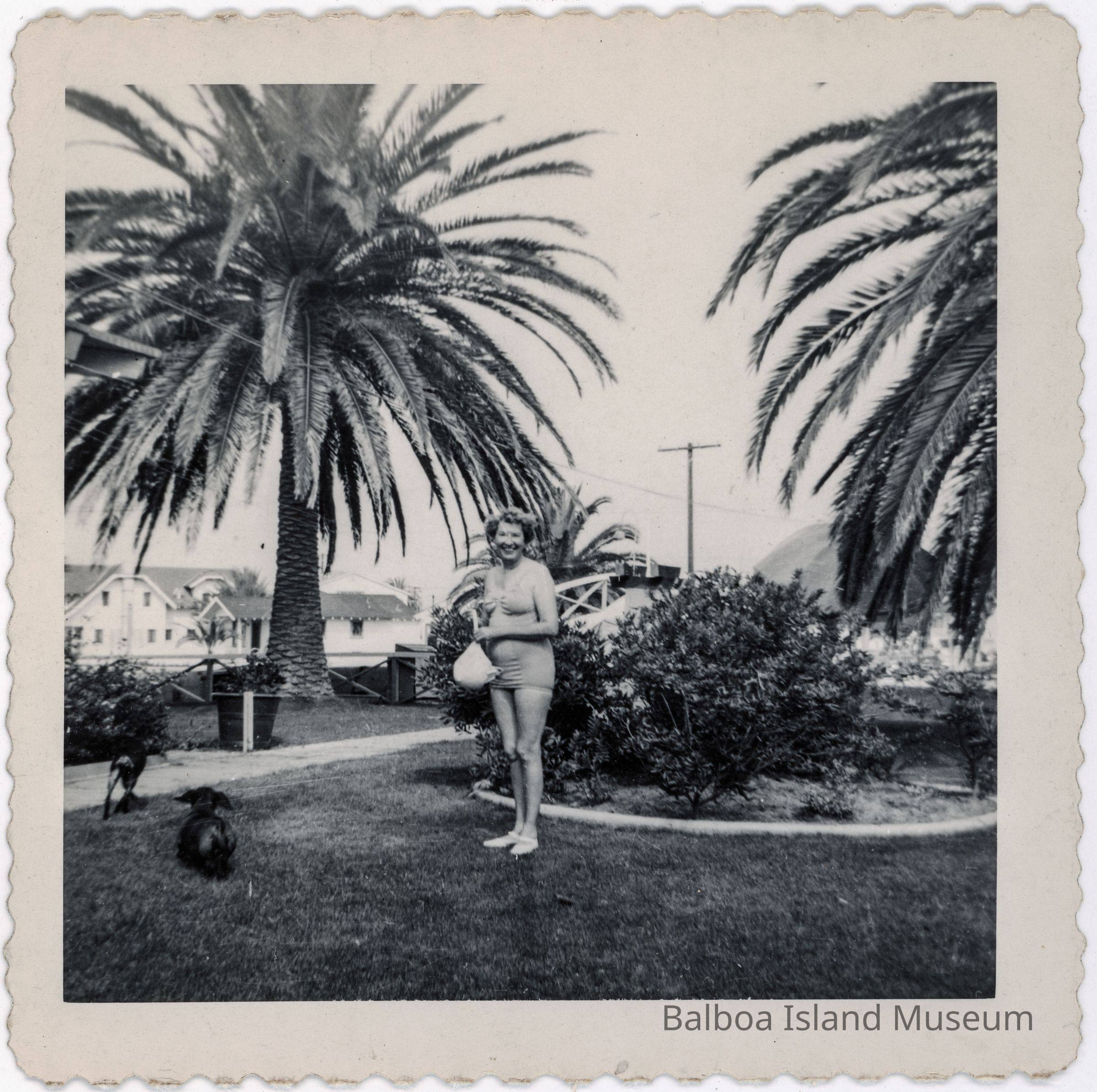 Mrs. McNamara and her dogs on Collins Island with the bridge in the backgroundPhotograph Details