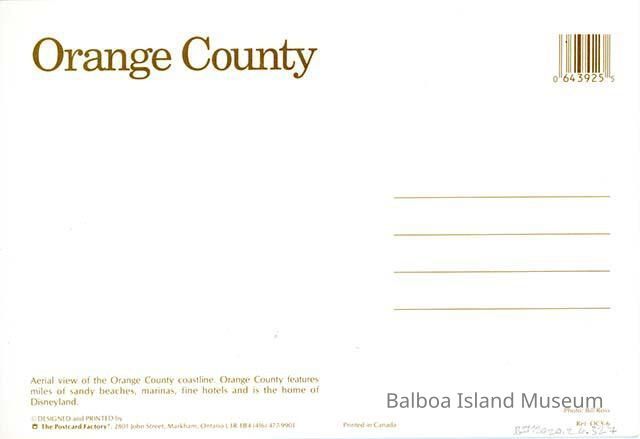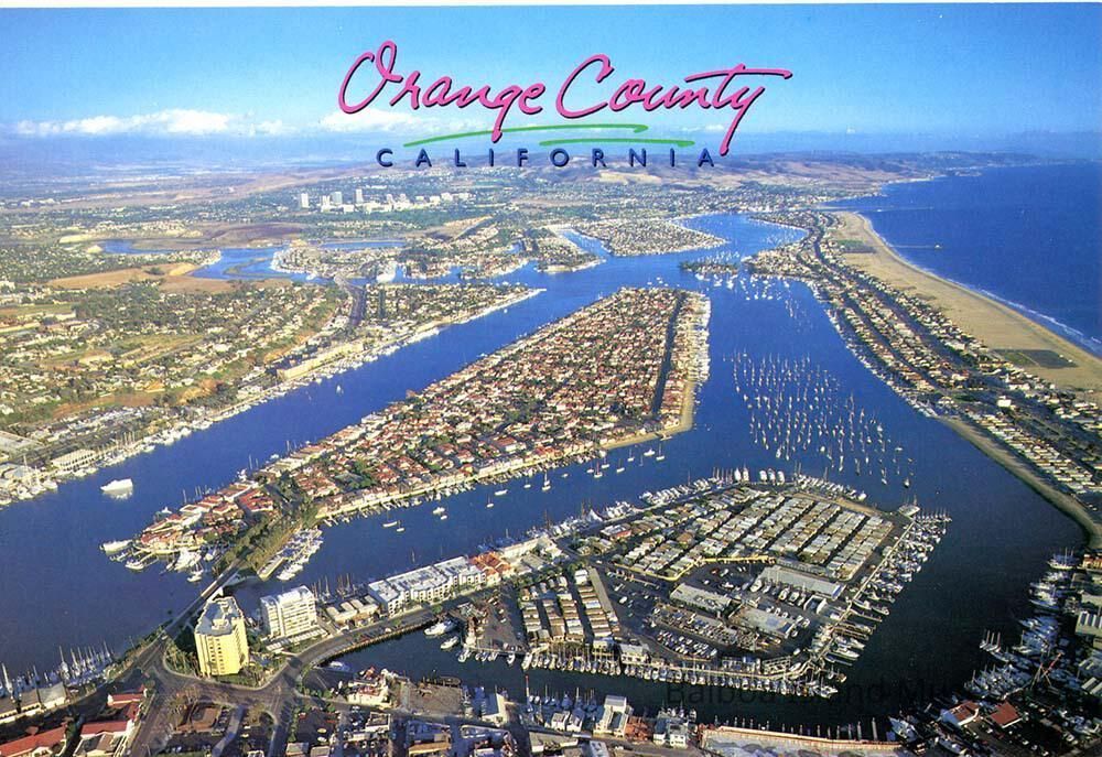 Two copies of a color aerial postcard of Lido Isle and Lido Peninsula taken from over the Newport section just before the bridges to the Island and Peninsula. "Orange County" is written across the top of the card in red cursive style script and underlined with green lines. "California" is printed below in blue.