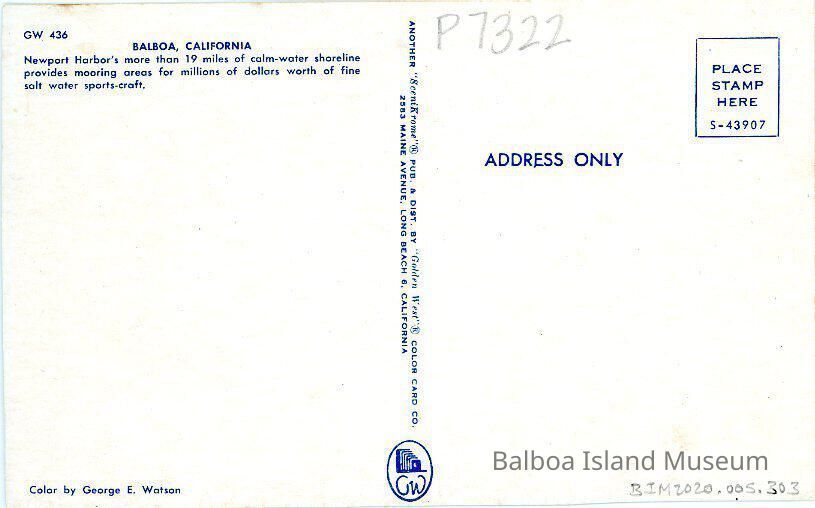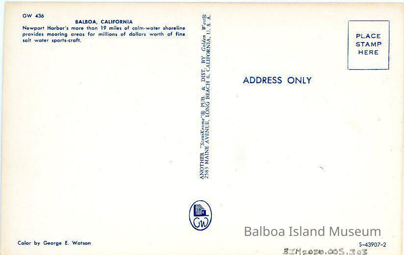 Both unused. Published and distributed by Golden West. Photographs by George E. Watson. There is a small blurb about Newport Harbor in the upper left corner on the back. The stamp box on one postcard also includes the print number while the print number on the other postcard is in the bottom right corner.Subject