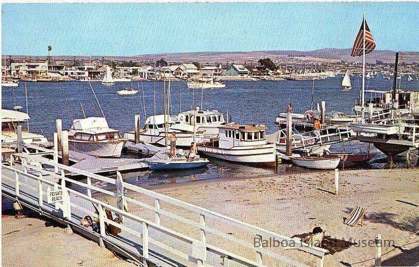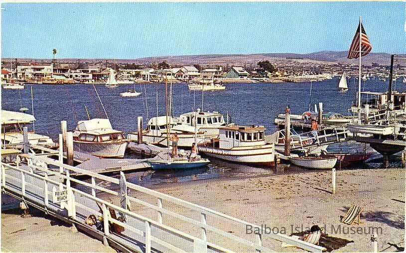 Two color photograph postcards of a private pier and beach taken from the boardwalk on the Balboa Peninsula looking towards Balboa Island and South Bay Front near Agate Avenue. There is a flat up on one of the piers near by and a number of boats are docked along the shore. Across the harbor, the Ferry landing, part of the Beek building, and the market are visible on the left side.