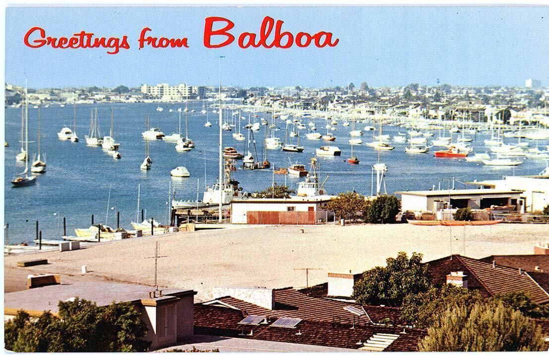 A color photograph of the harbor and the beach area beside the Newport Beach Harbor Patrol . The houses across the harbor from the open space might be Balboa Island.
