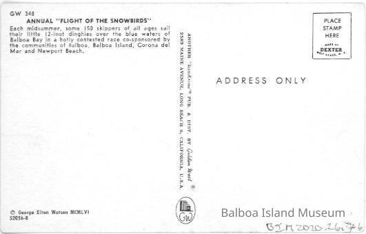 Published by Golden West in Long Beach. Photograph by George Elton Watson. Postcard number GW 348. Printer number 52056-B.Subject