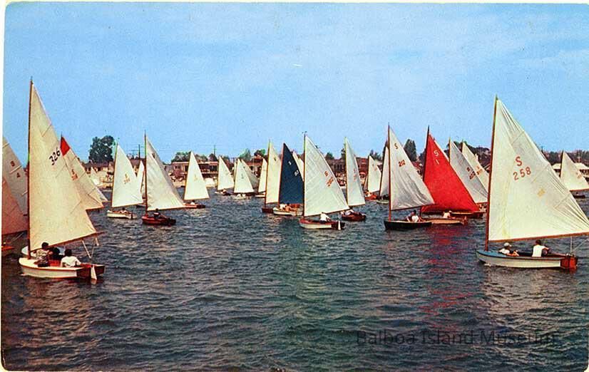 A color postcard of the flight of the snowbirds on the harbor. There is one red and one blue sail among the boats in the photograph.