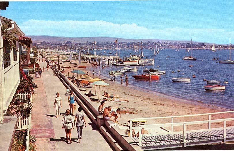 A color postcard photograph looking down South Bay Front from the balcony of 602 South Bay Front.There are several groups of people walking along the boardwalk or sunning on the beach just on the other side of the sea wall.