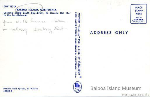 Never sent. There is a small blurb about the photograph on the back. Photograph taken by George Elton Watson, published by Golden West in Long Beach, and printed by Dexter Press, Inc. in West Nyack, New York. Postcard number GW 317-A, 44924-B.Subject
