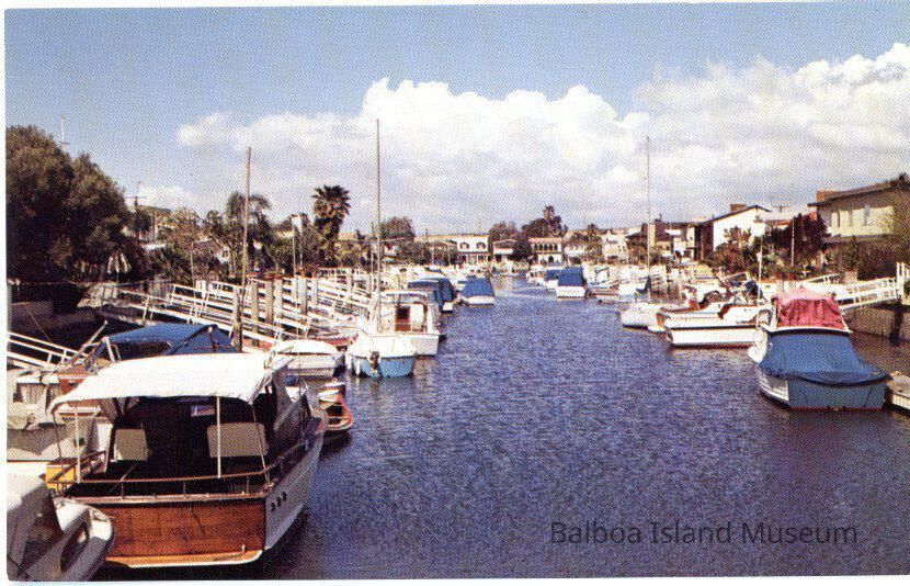 A color postcard of one of the channels around Newport Island with boats docked to either side. The channel appears quite narrow and houses with docks sit to either side of the channel. Which channel it is exactly is unclear.