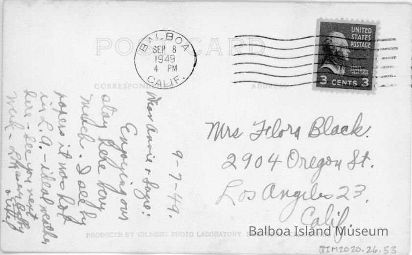 Sent on September 8, 1949 to Mrs. Flora Black in Los Angeles. Sent by Ashley, Betty and Ethel. Published by Golden West, printed by Gilmore Photo Laboratory in San Pedro.Subject