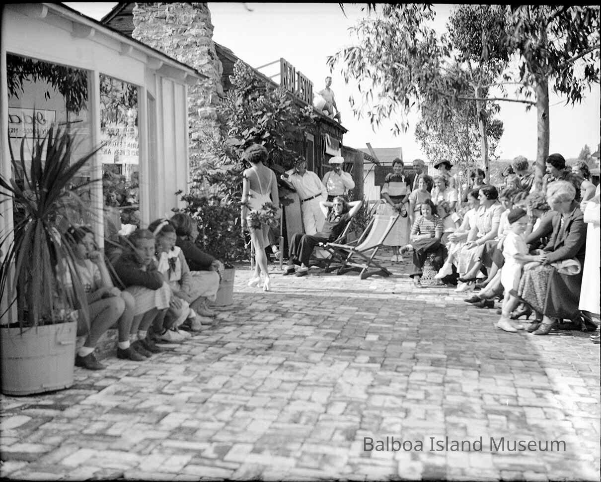 A digital copy of a sheet negative of the Marine Avenue Dechamps Fashion Show of 1935. Image is of a female model walking off the "stage", a section of brick in front of the retail store beside Hal's real estate office.