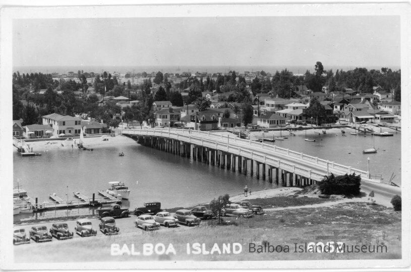 Two copies of a black and white photograph postcard of the Balboa Island bridge taken from the area that is now Irvine Terrace. There is a marina to the left of the bridge with a number of cars parked in front of it. The photograph only shows Balboa Island.