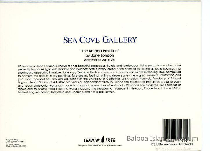 A large notecard with a print of a painting by Jane London on the front. The painting is of the Balboa Pavilion with various boats passing in front of it including several with multi-colored sails. There is a marbeled blue border around the edge.