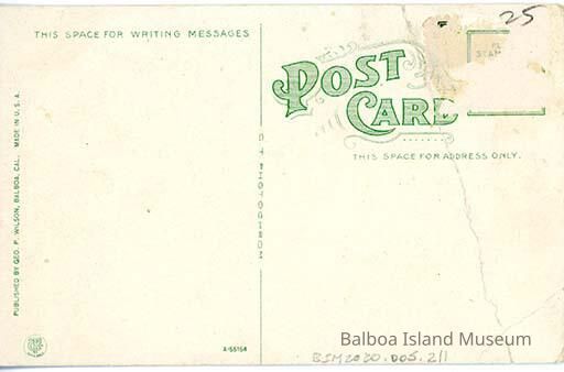 Unused or unsent. The back is divided. There are signs a postage stamp was once pasted in the corner but there is no message, address, or addressee. Published by George P. Wilson in Balboa, California. Made in the USA by Curteich-Chicago. Printer number A-55154.Subject