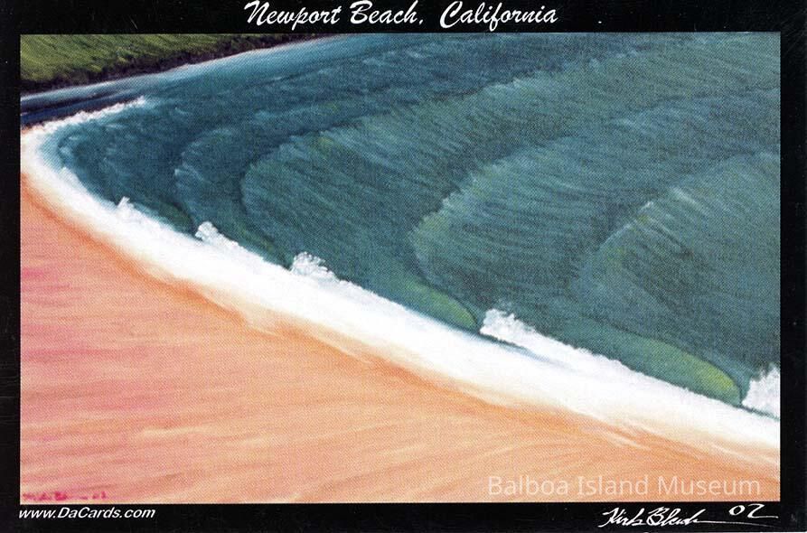 A postcard style print of a painting of waves hitting the shore. The beach is curved and there are breaks forming along the edge where the ocean meets the sand. It might have been painted of Corona del Mar beach based on the curve and the green above a cliff barely visible on the upper left corner. Black border with white lettering. Artist is Kirk Blesoh [?] and was painted in 2002. Printed using www.DaCards.com.Subject Place