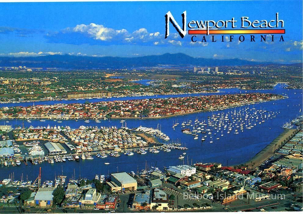 A color aerial photograph of Lido Island and Lido Peninsula taken from over Newport Beach looking inland towards Upper Newport Bay and Fashion Island. The crab cooker is in the bottom middle of the image.