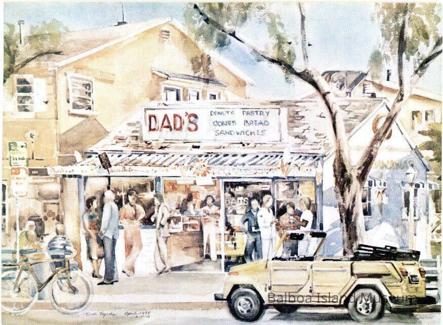 A color postcard featuring an image of Dad's Donuts pained by Ruth Hynds in April 1978. The image shows the front of dads pained from across the street with people standing around the doorway chatting, eating and drinking.