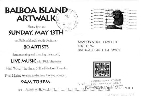 A postcard advertisement for the 2001 Balboa Island Artwalk. It features a painting by Huse of several sailboats on a beach with kids sitting on them or moving between them. The back is an advertising paragraph for the event. It was sent by the Debra Huse Studio at 229 Marine Avenue, STE E. to Sharon and Bob Lambert at 130 Topaz. Sent on May 02, 2001 from Santa Ana California.