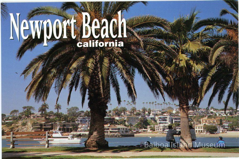 A photograph of the harbor entrance channel taken in West Jetty View Park. Corona del Mar is across the channel entrance. The cove photographed is the one immediately to the right of China Cove. There is a large boat entering the harbor and a series of short palm trees in the park.