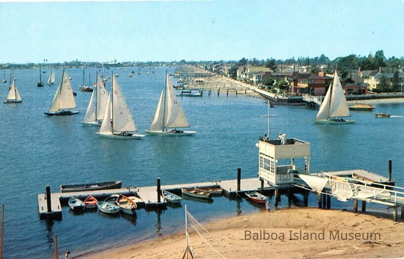 A color photograph of the very end of South Bay Front on little island taken from immediately across at the Balboa Yacht Club. There are about five sailboats supposedly racing out of the Balboa Bay next to 1810 South Bay Front.