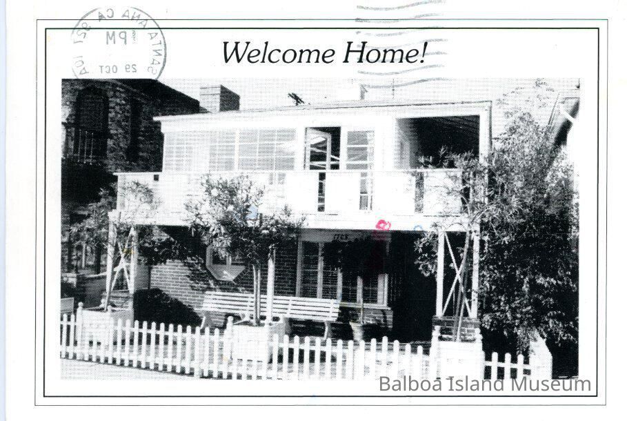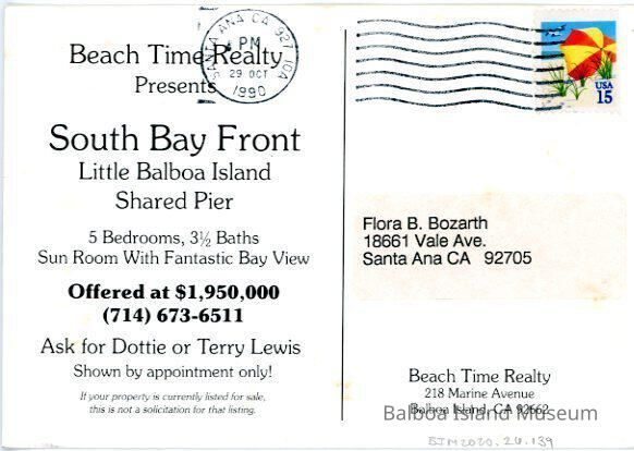A black & white advertising postcard for 1708 South Bay Front on Little Island. The image on the front is in black and white. The back has some minor details of the property and the price of $1,950,000. Listed by Dottie and Terry Lewis. Sent to Flora Bozarth in Santa Ana on October 29, 1990.Subject
