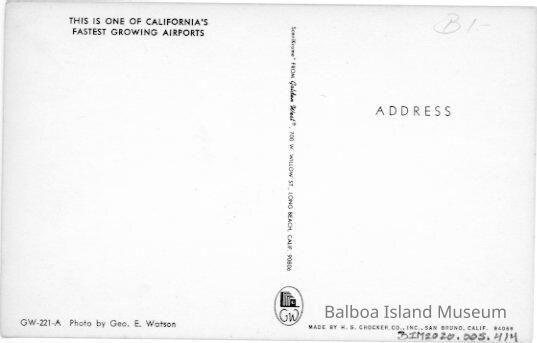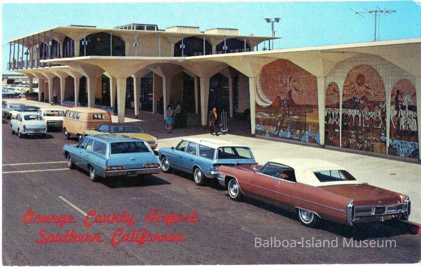 A color postcard of the John Wayne/Orange County airport entrance or exit with cars lined up picking up or dropping off passengers. The airport was one terminal at the time. There is a mosaic on the outside wall. The building has one story on one side and two stories on the other side. The title is written in red cursive-style script.
