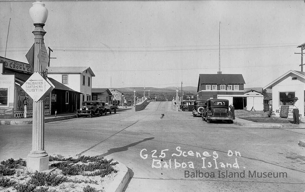 Four copies of a black and white postcard looking towards the little island bridge. Taken from the barrier in the middle of park avenue. Wallies is on the left. There is a small sign with directions to Palisades, Santa Ana, and Tustin.
