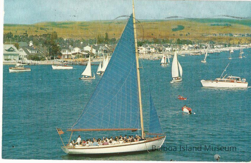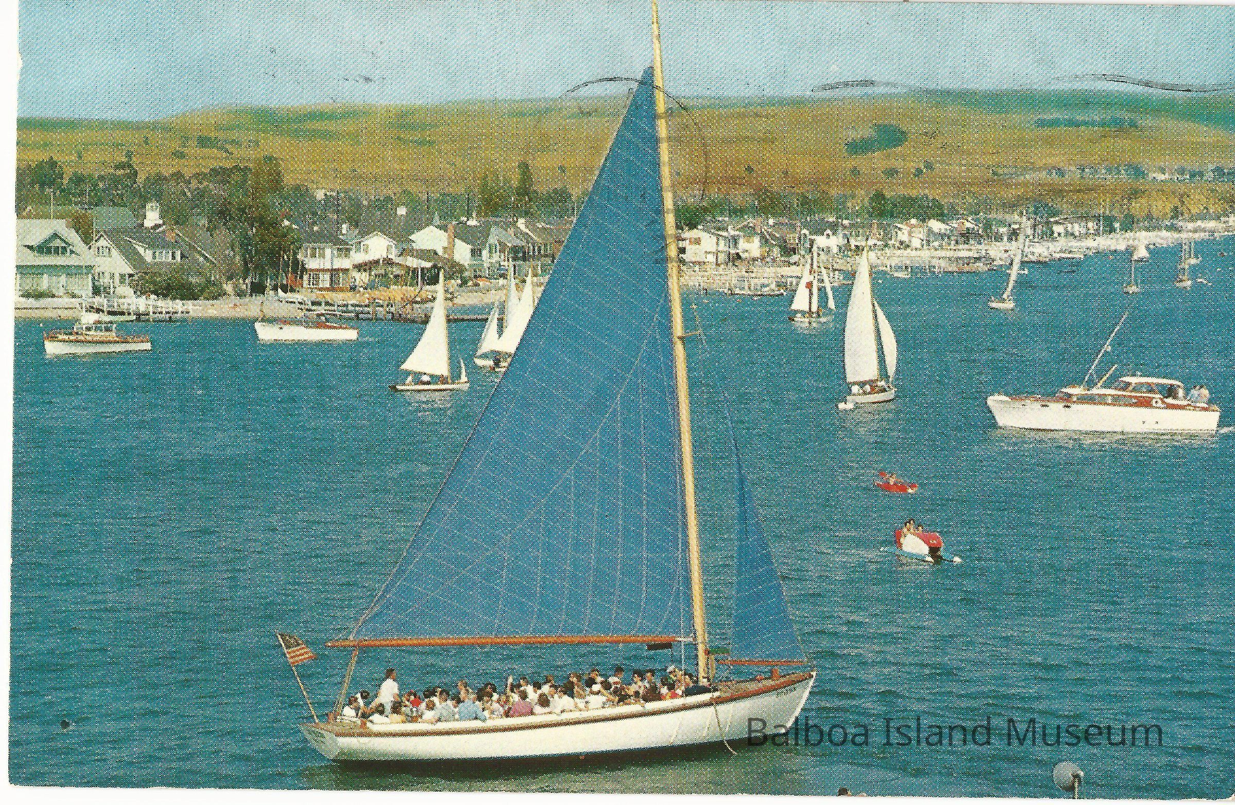 "The "Bay Queen," a trim auxilary sloop with blue sails, takes visitors for a scenic trip over Balboa Bay past Balboa Island, Cornona del Mar and out the ocean at the Harbor's jetty."