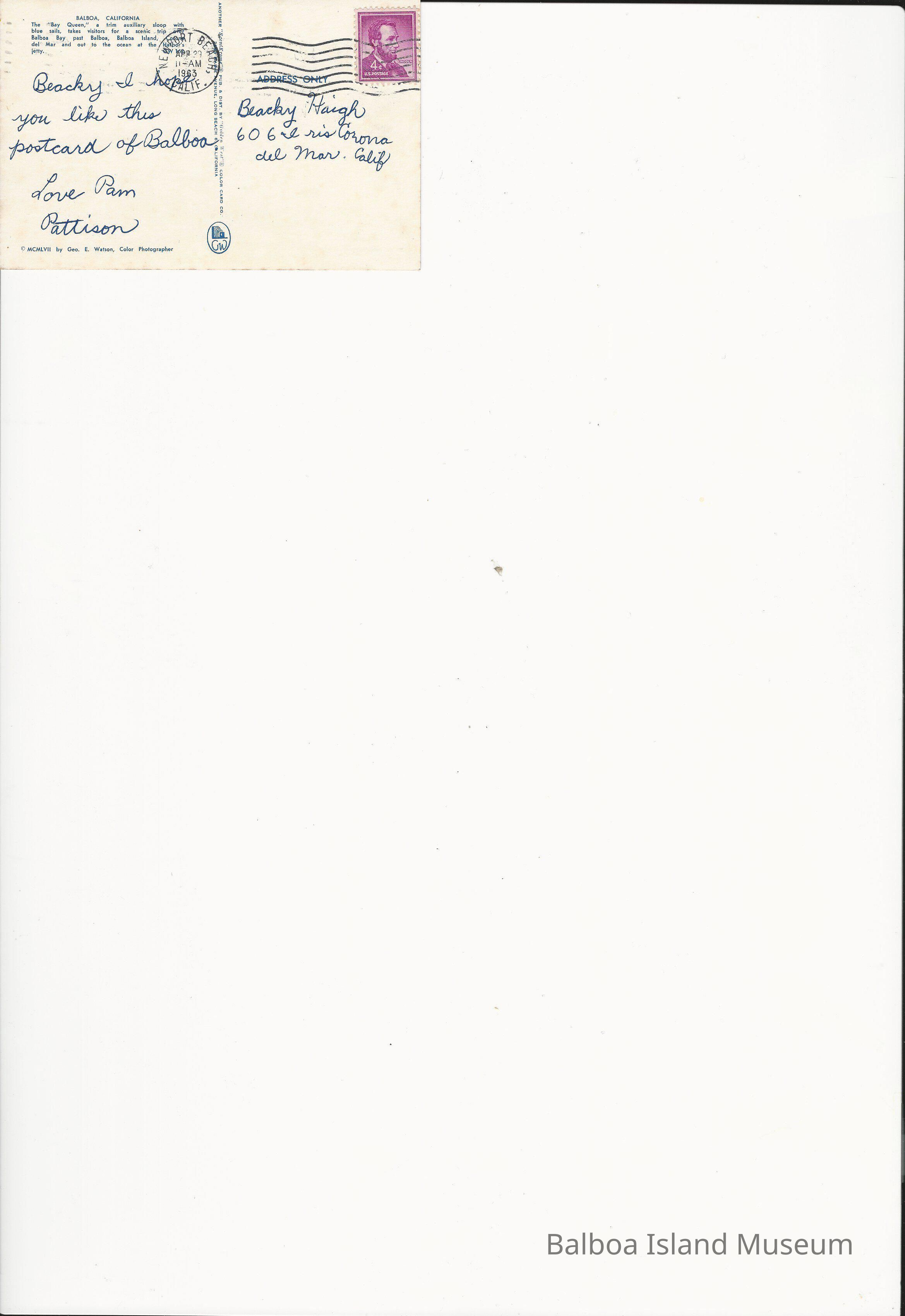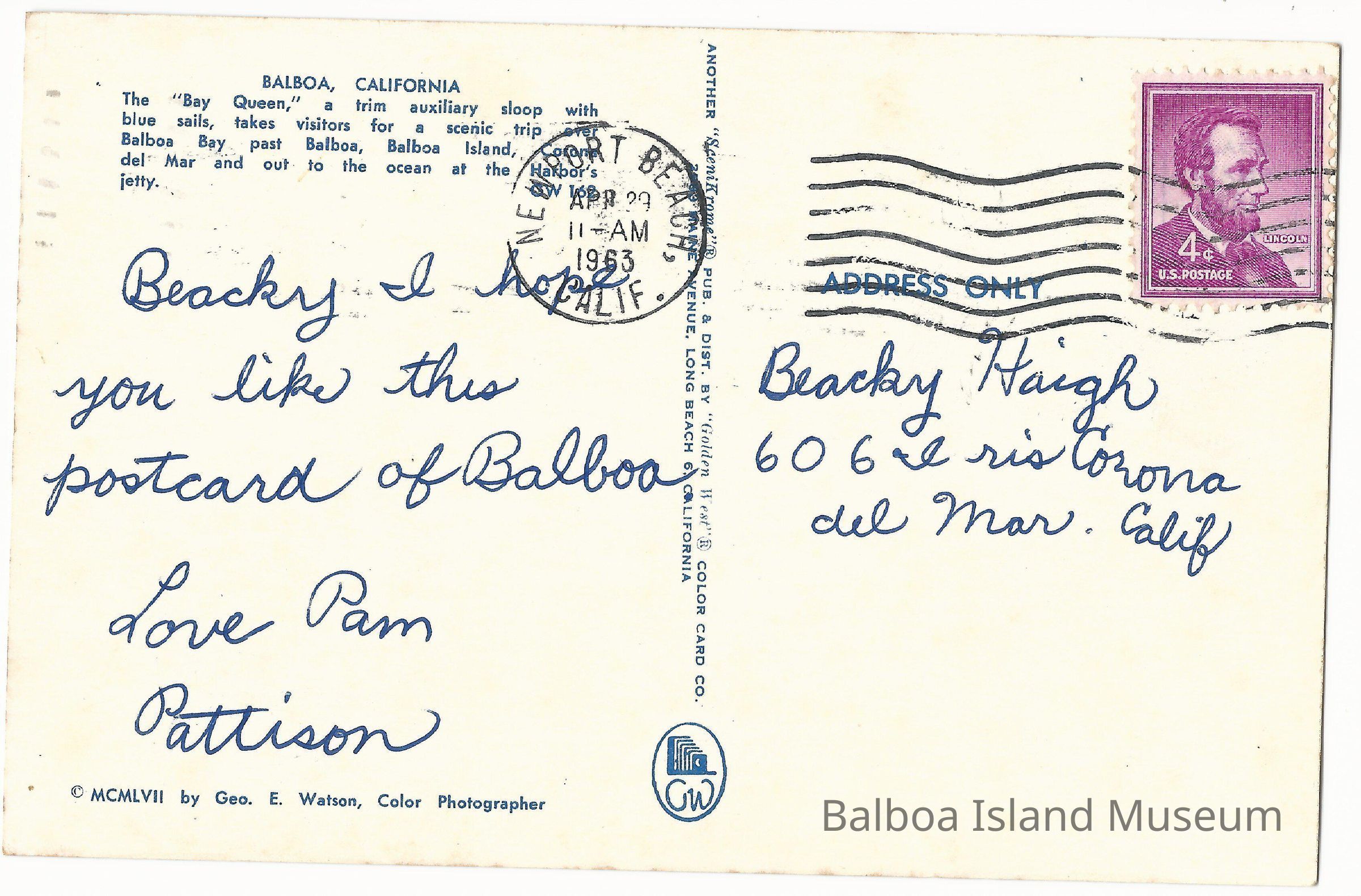 There is also a note on the back addressed to a Beacky Haigh at 606 Iris, Corona del Mar, Calif. It reads as follows: