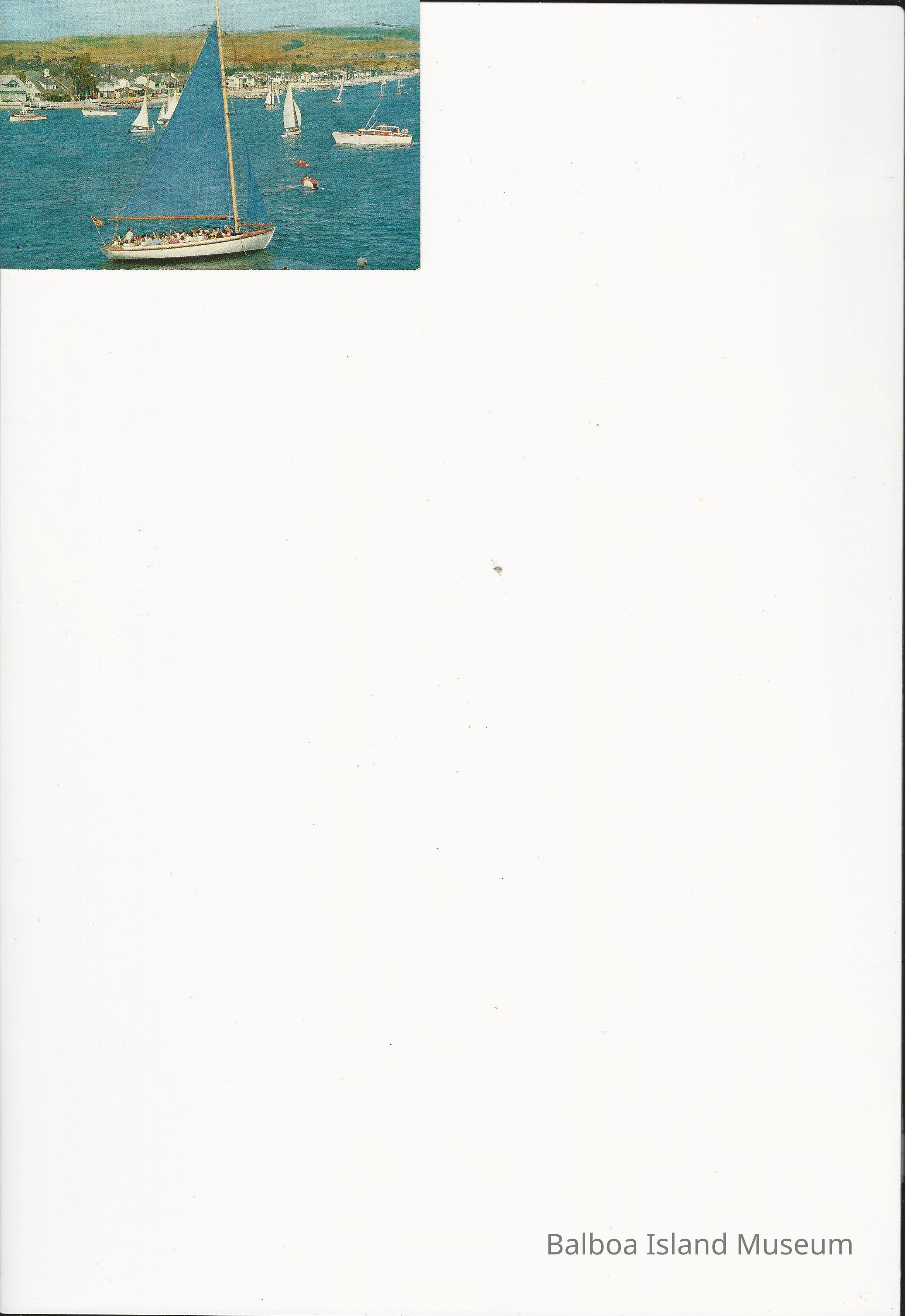 A postcard displaying a sailing boat carrying a large group oif people. It has a mainsail and a jib. It is on the Newport harber around the turn near Collins Avenue on South Bay Front.