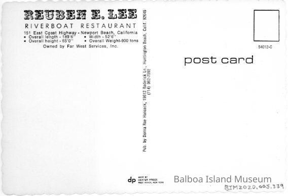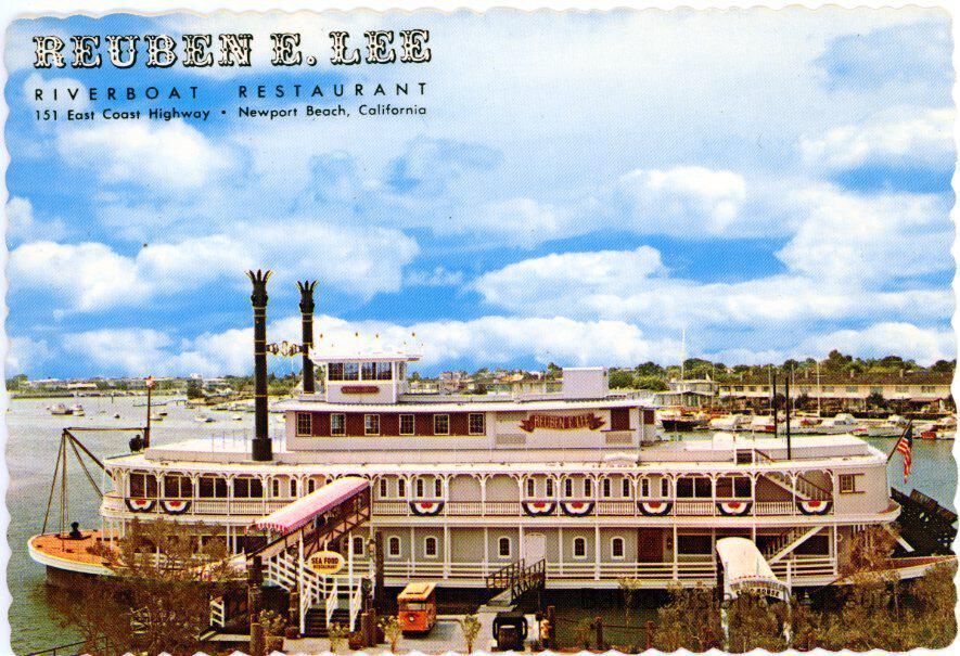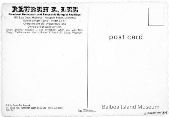 Three copies of a color postcard of the Reuben E. Lee restaurant taken from an elevated position on the shore. Shows the entrance side of the boat and both restaurants, the Seafood Restaurant and the Sternwheel Cookhouse. There is a third gangway that appears to be a staff entrance. A small trolley, either a model or an electric golf cart, is positioned between the gangway for the Sea Food Restaurant and the staff gangway. All three have scalloped edges.