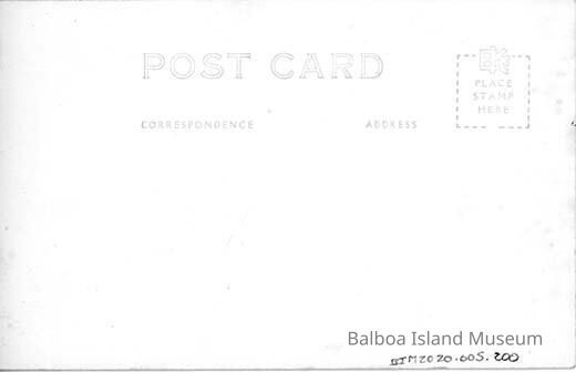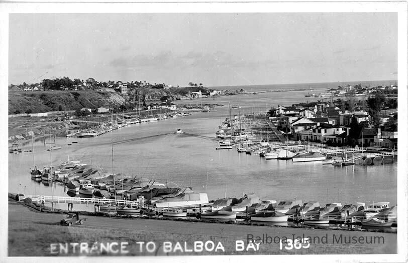A black and white photograph postcard of Balboa Bay showing the harbor entrance in the distance and the curve of the harbor around Little Balboa Island. There is a motor boat driving down the harbor in the photograph.