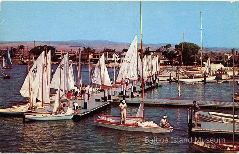 A color postcard of sailboats docked at the Newport Harbor Yacht Club. There are people on the docks prepping sailboats to go out and one that doesn't has its sails up that might be coming in. Photograph taken in 1960.