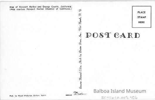 A color postcard with an image of a Claude Putnam map of Newport Harbor and part of the Orange County area. Very detailed, not well printed. There are beige lines to either side of the map because the image was not large enough for the postcard.