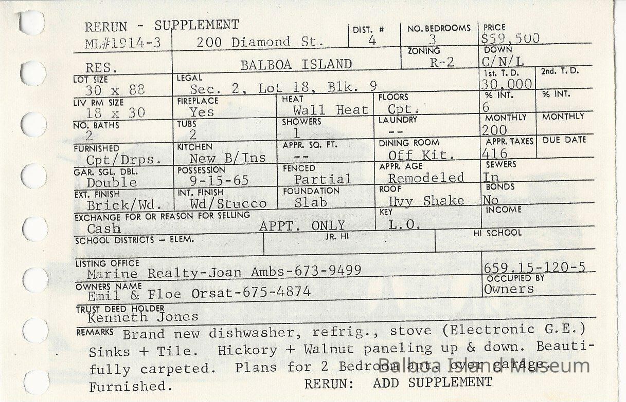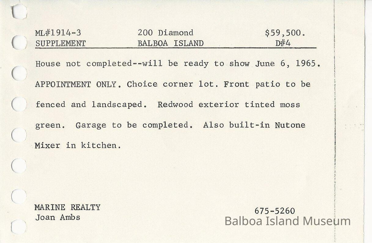 200 Diamond Street info card. White notecard with info on the front, picture of the house on the back. Extra white notecard with info on construction work being done on the house.Collection