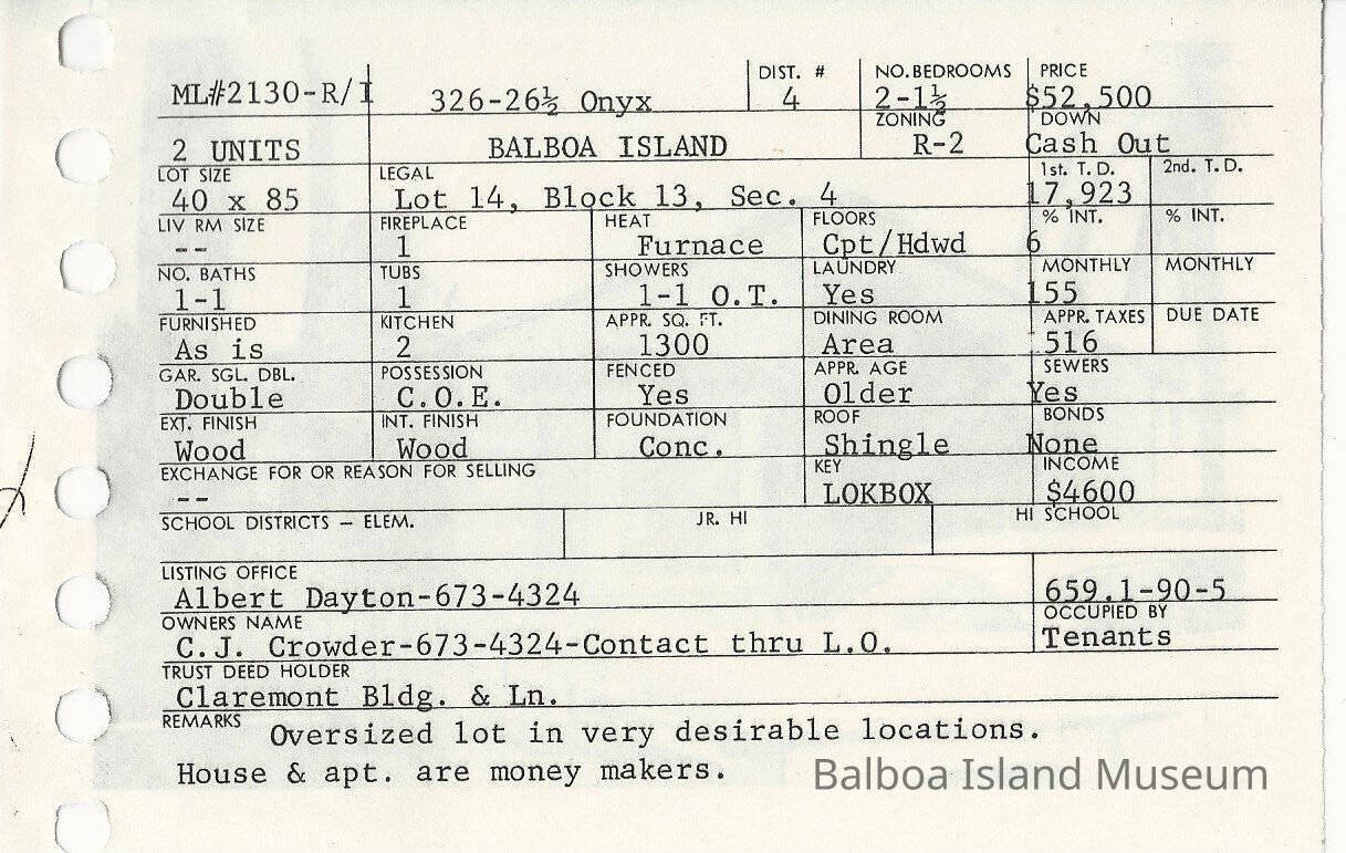 326 Onyx Avenue info card. White notecard with info on the front, picture of the house on the back.Collection