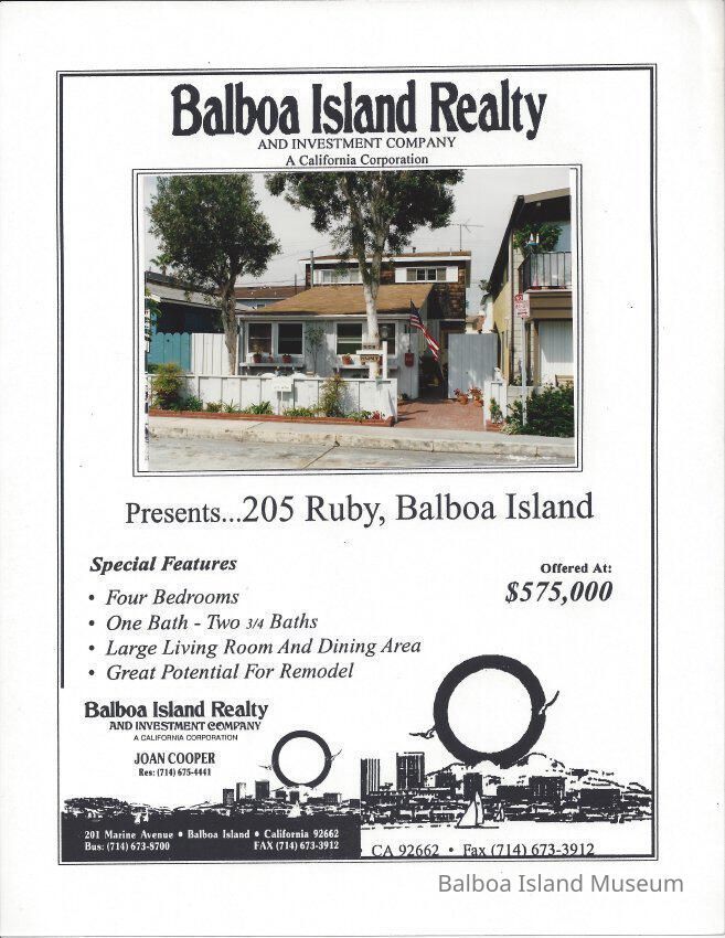 Real Estate brochure with color photo of home at 205 Ruby Avenue prepared by Balboa Island Reality. The house was listed by Joan Cooper.Lexicon