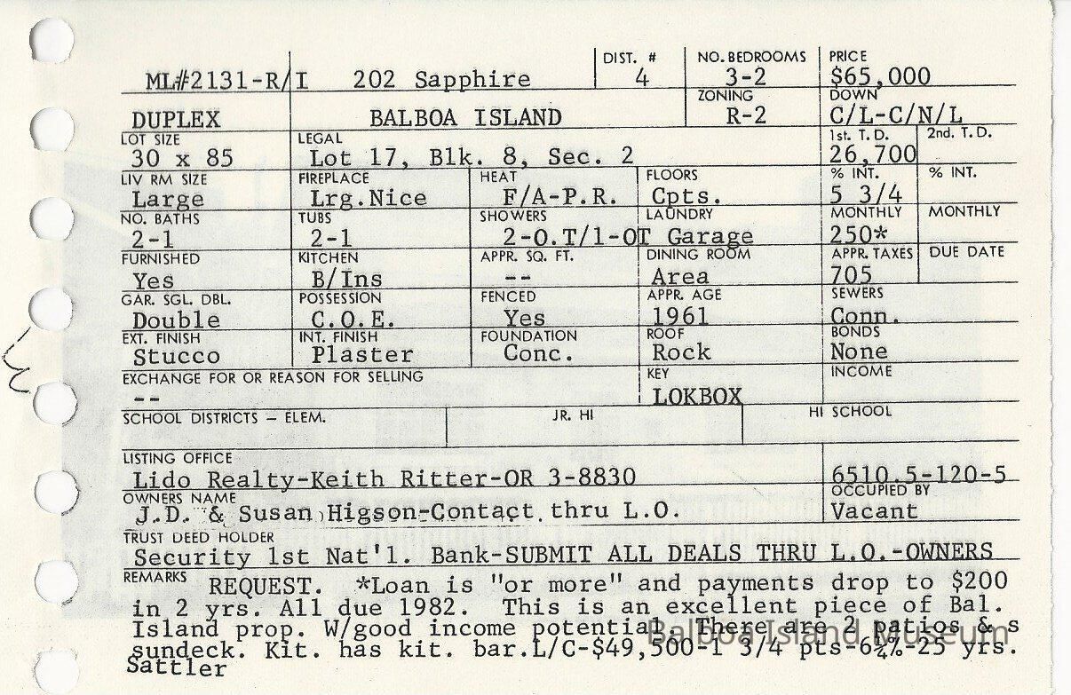 202 Sapphire Avenue info card. White notecard with info on the front, picture of the house on the back.Collection