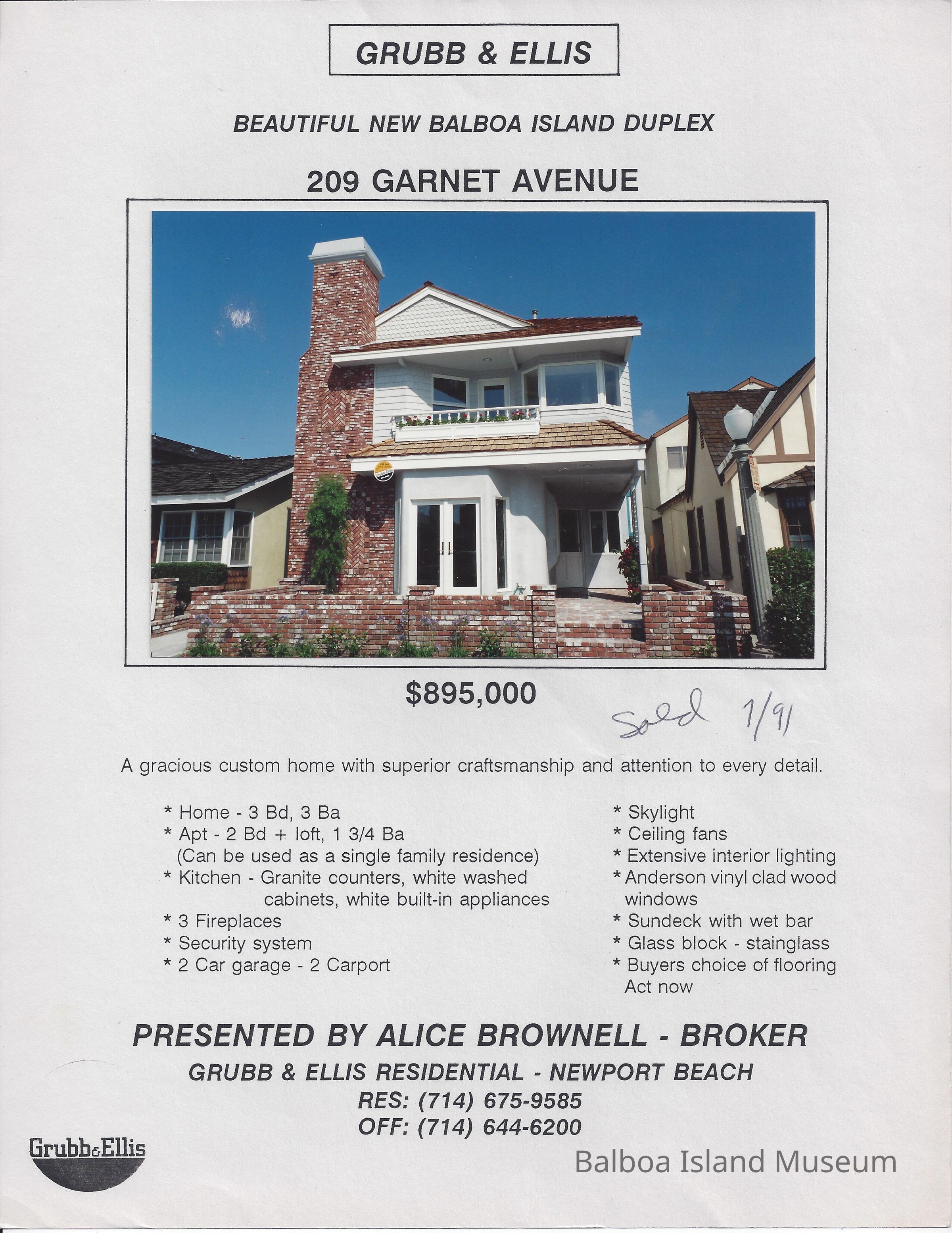 Real Estate brochure with color photo of home at 209 Garnet Avenue.Lexicon
