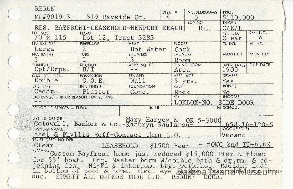 519 Bayside Drive info card. White notecard with info on the front, picture of the house on the back.Collection