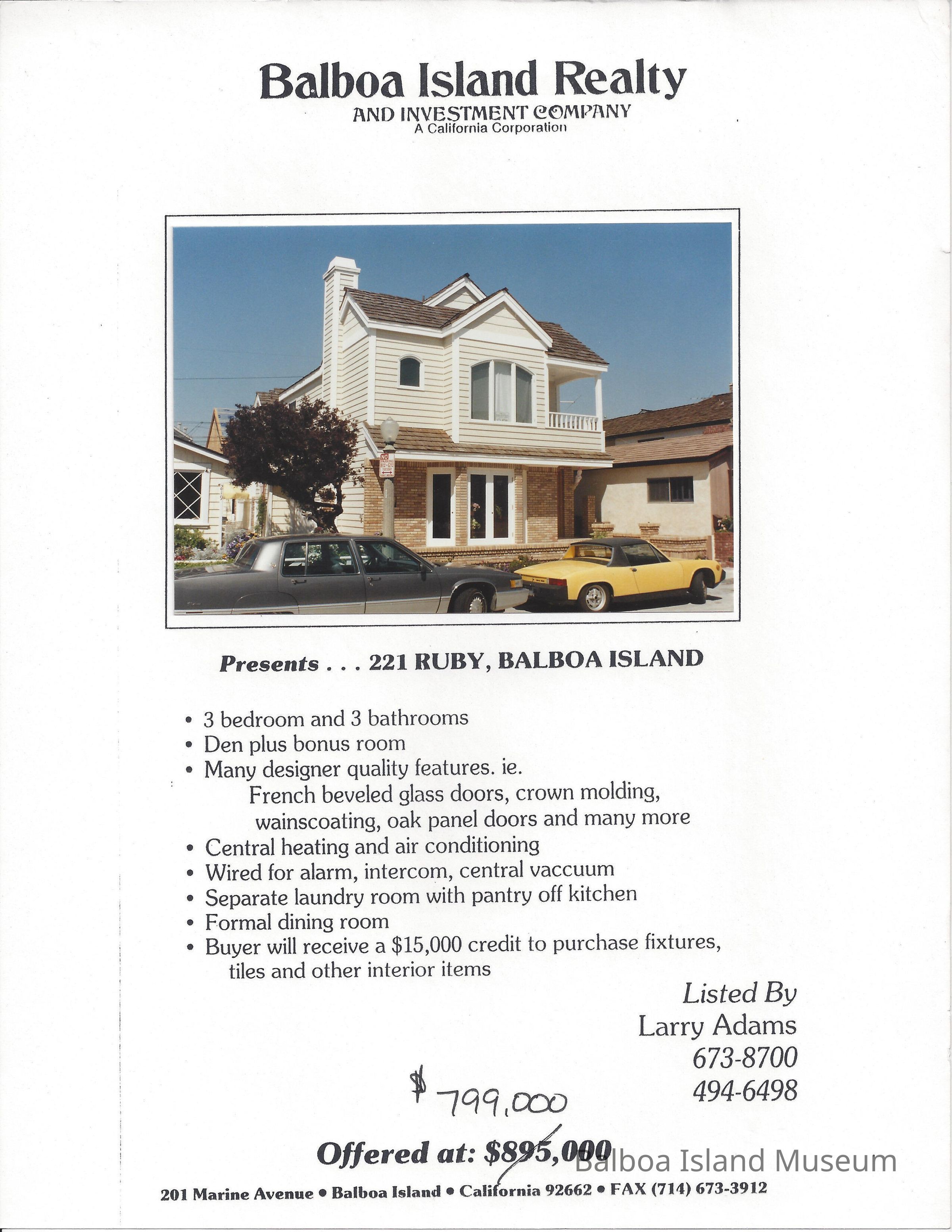 Real Estate brochure with color photo of home at 221 Ruby Avenue.Lexicon