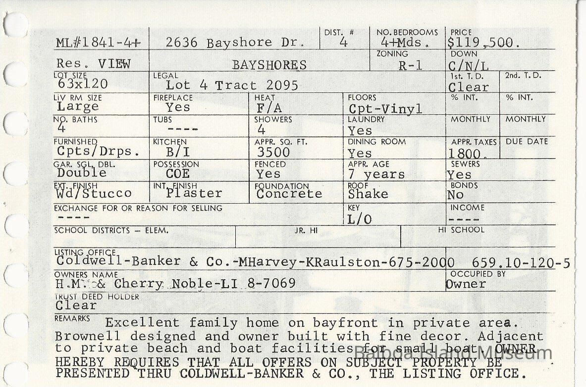 2636 Bayshore Drive info card. White notecard with info on the front, picture of the house on the back.Collection