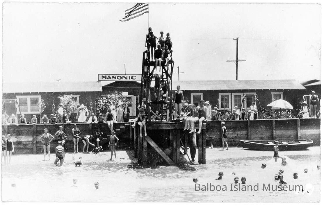 A black and white postcard of the diving platform with kids on the platform and in the water. The sign for the Masonic Camp is visible behind the platform, though camp is obstructed byt the diving platform, There is a set of stairs visible to the left of the pier giving access to the beach.
