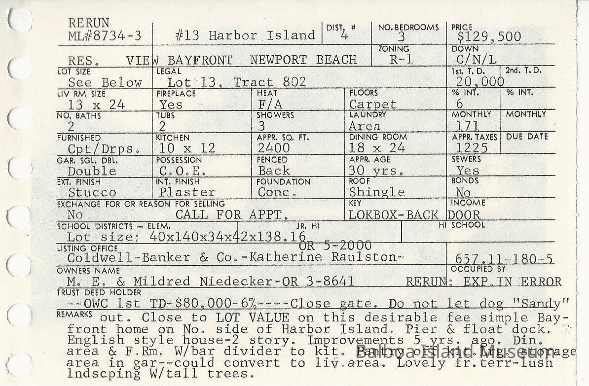 13 Harbor Island info card. White notecard with info on the front, picture of the house on the back.Collection