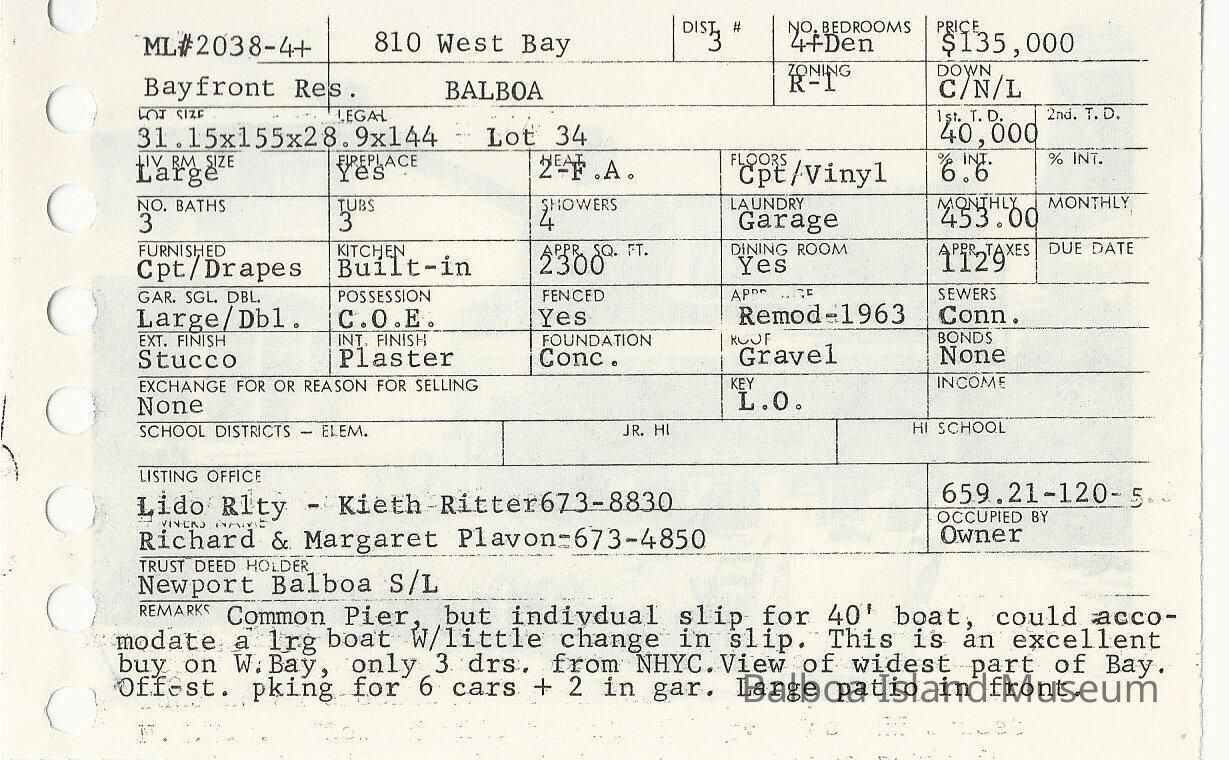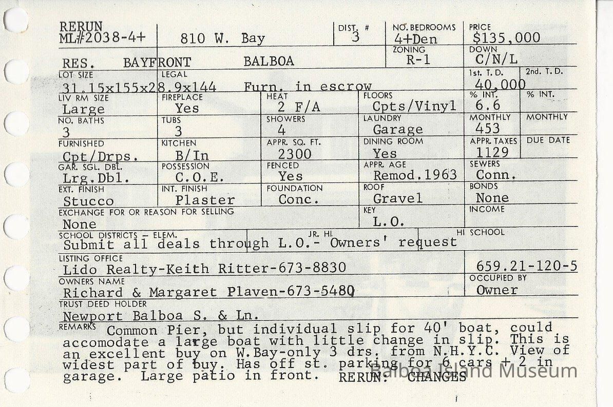 810 West Bay Street info card. White notecard with info on the front, picture of the house on the back. A second rerun info card with the same info and picture.Collection
