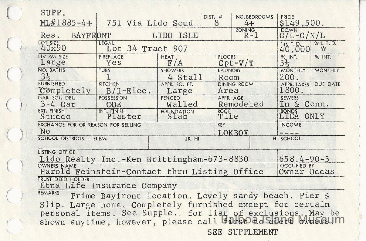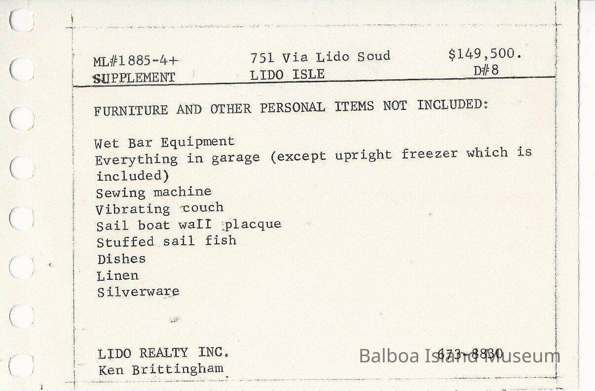 751 Via Lido Sound info card. White notecard with info on the front, picture of the house on the back. Additional info card with info on belongings.Collection