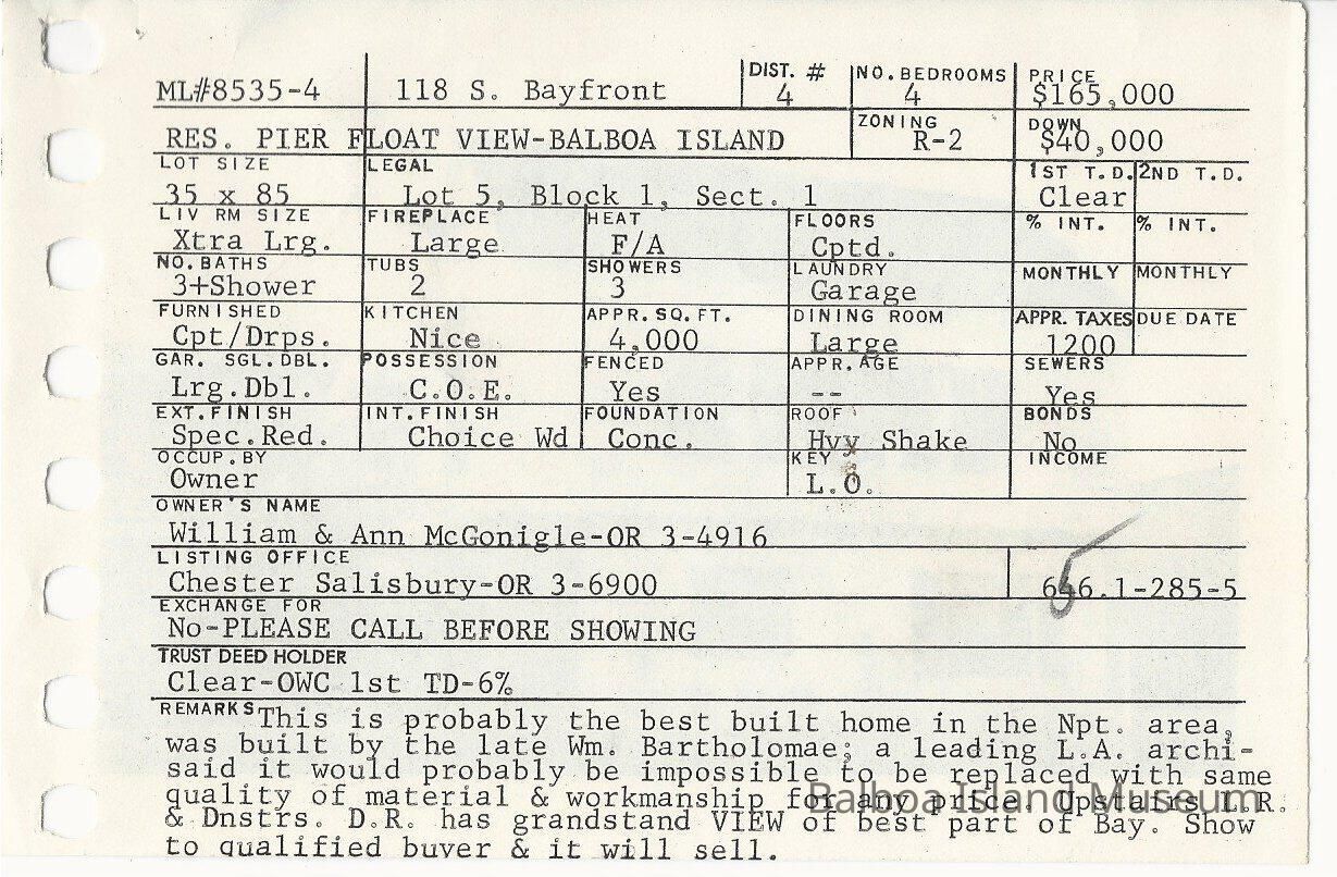 118 South Bayfront Drive info card. White notecard with info on the front, picture of the house on the back.Collection
