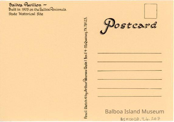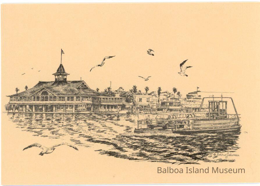 A thin postcard of a sketch of the Balboa Pavilion done in thin ink lines by Arthur Patureau. Done from the west side on the water with the Balboa Ferry passing on the right side heading for the island.