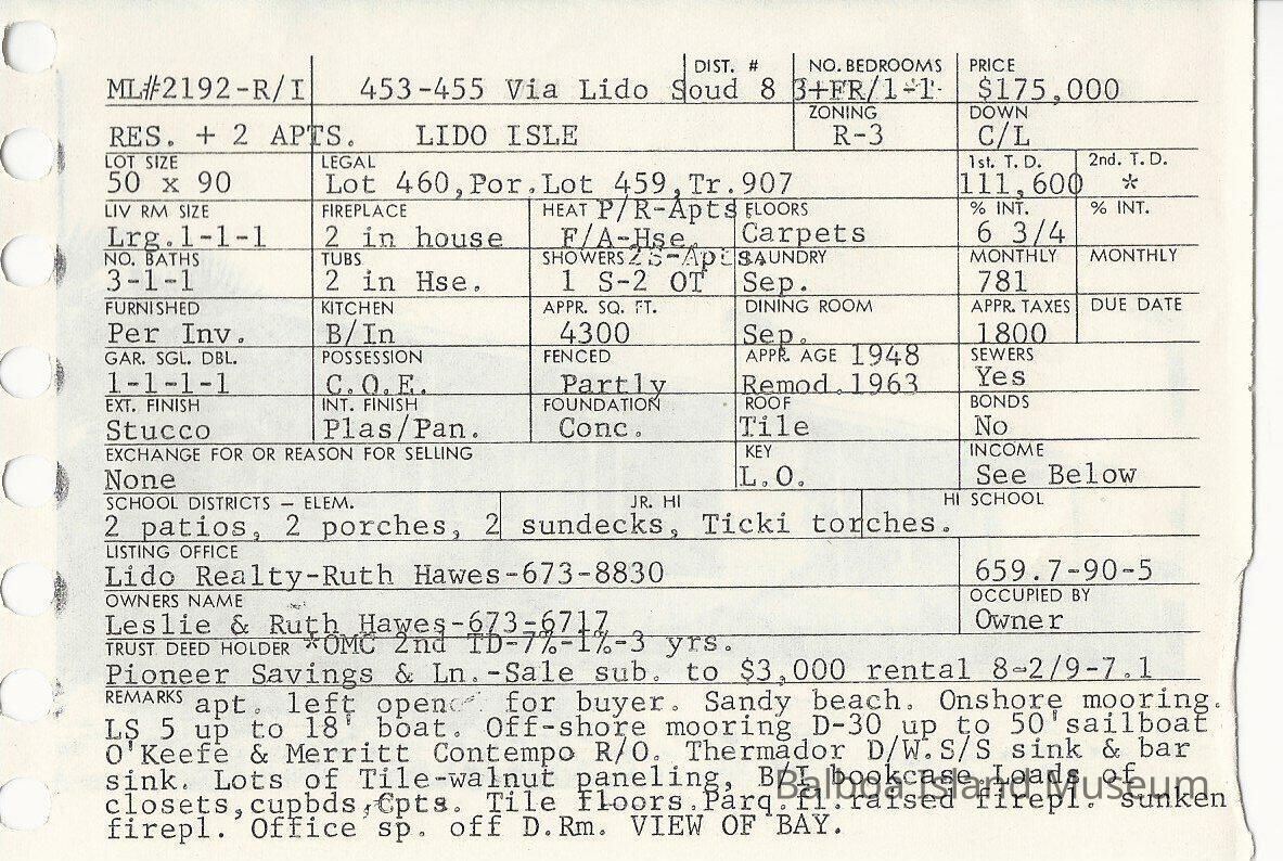 453-455 Via Lido Sound info card. White notecard with info on the front, picture of the house on the back.Collection