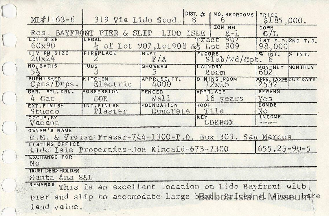 319 Via Lido Sound info card. White notecard with info on the front, picture of the house on the back.Collection