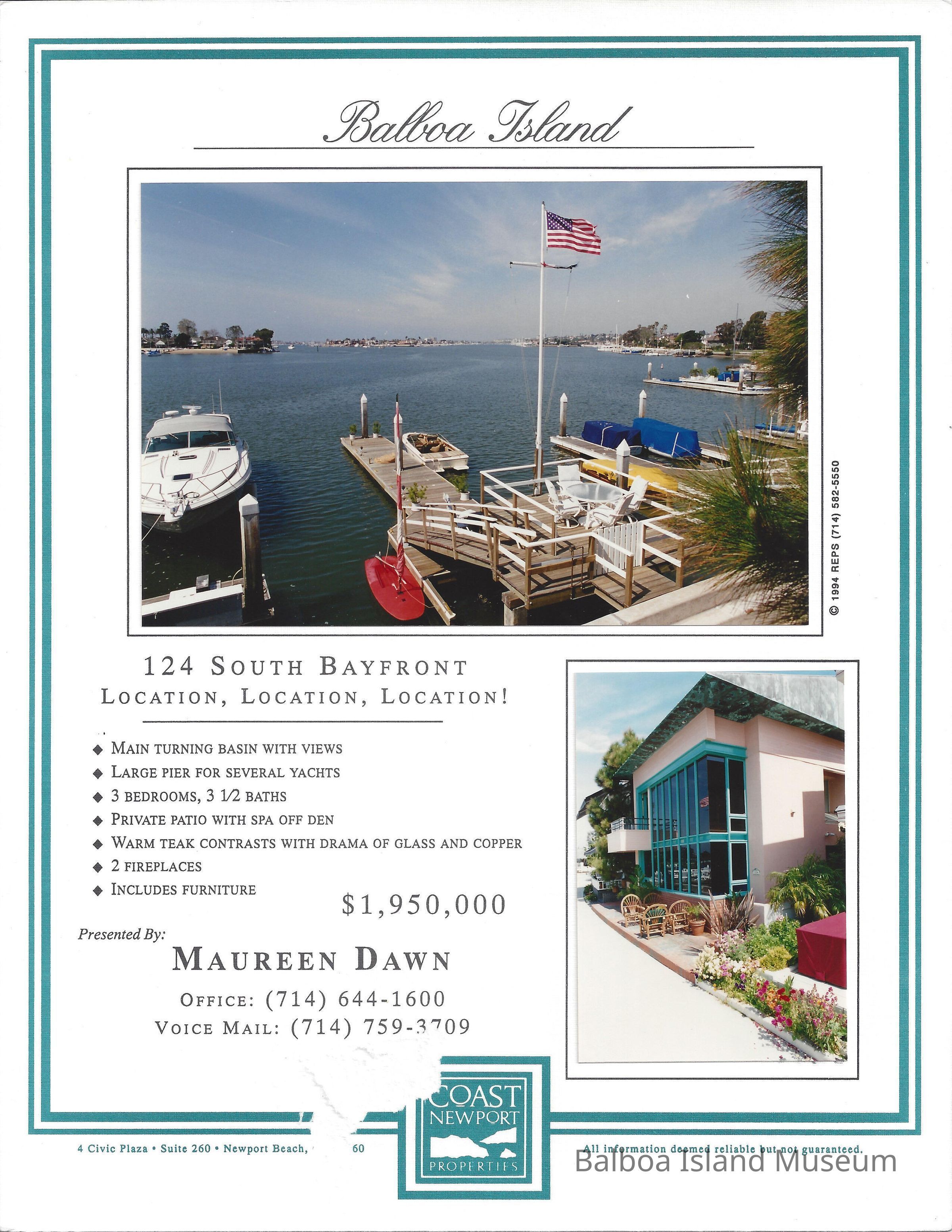 Real Estate brochure with color photo of home at 124 South Bayfront.Lexicon